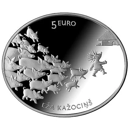 The reverse depicts a hedgehog leading pigs, with an ethnographic building fragment on the right. The top features "5 EURO," and the bottom is inscribed EŽA KAŽOCIŅŠ (HEDGEHOG'S COAT).