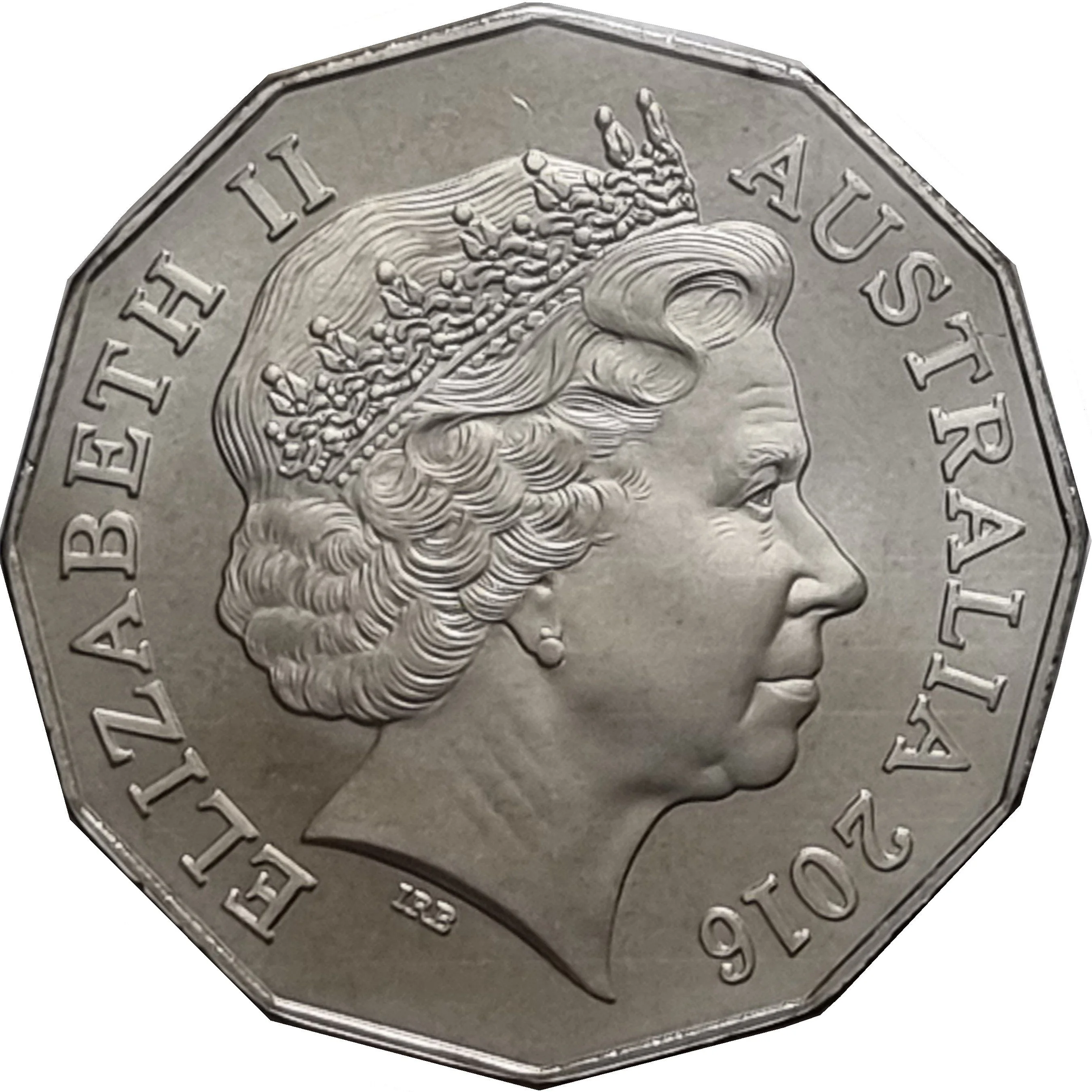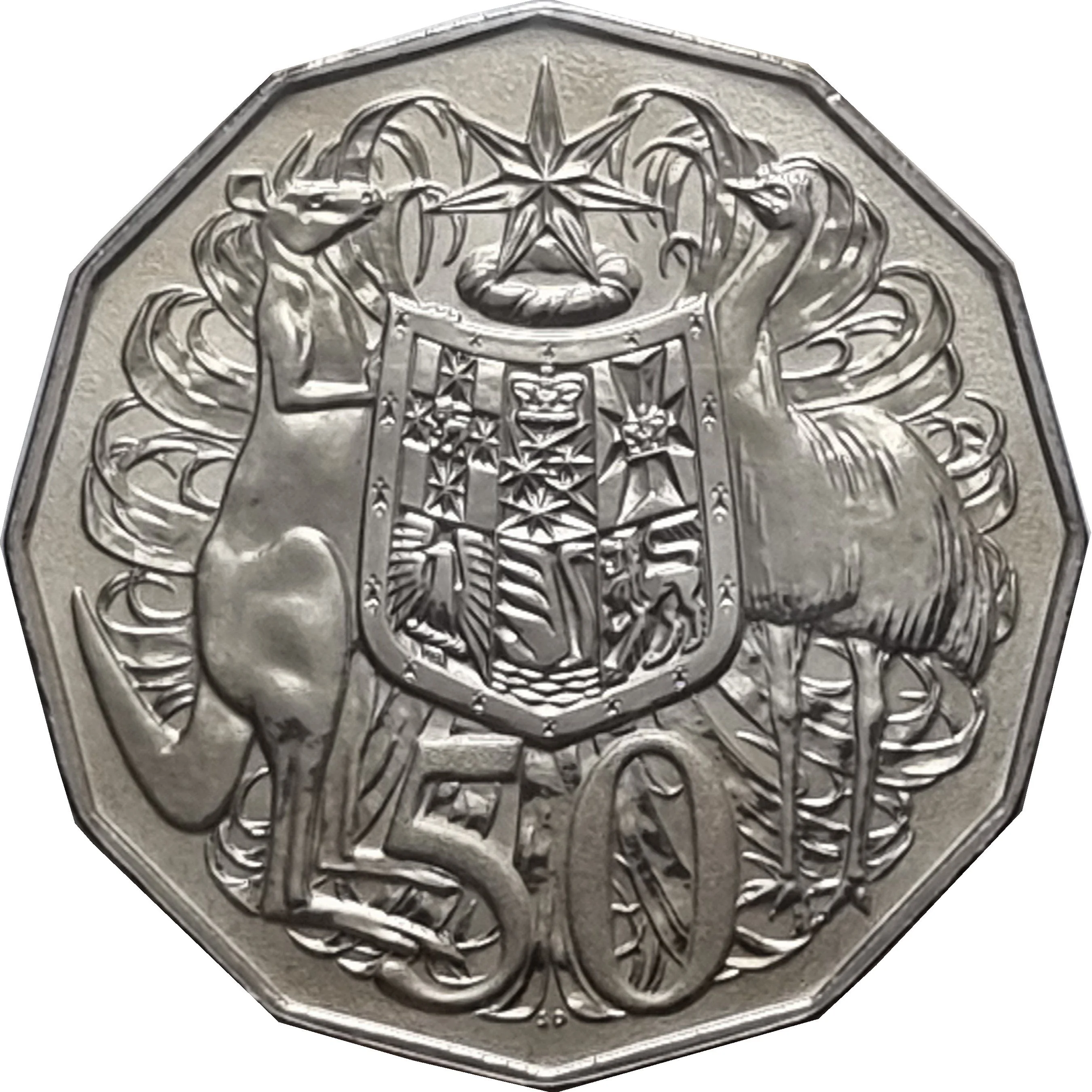 Australia's coat of arms, supported by a red kangaroo and an emu, with the numeral "50".