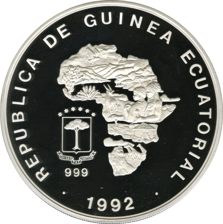 Equatorial Guinea's coat of arms at lower left. African map formed by landscapes, traditions, and wildlife.