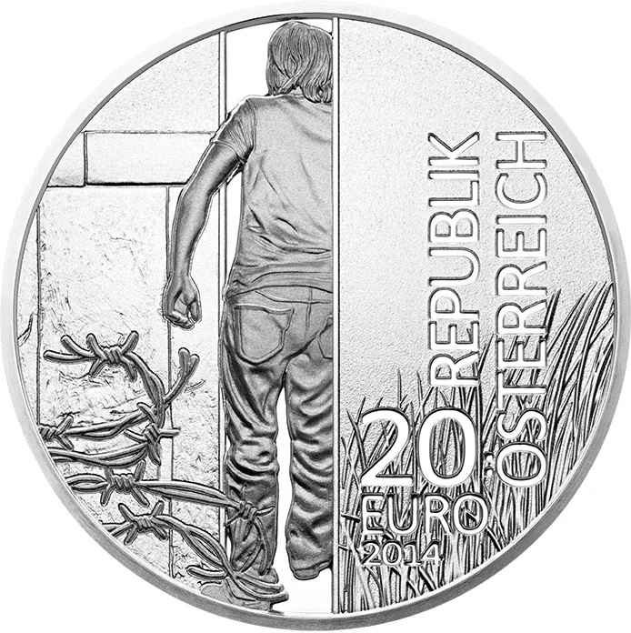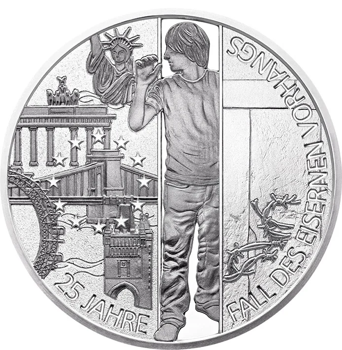 Description: The reverse depicts the same man entering the 'Free World', alongside landmarks symbolizing nations pivotal to ending the Cold War: Prague's Charles Bridge, Vienna's Riesenrad, Budapest's Chain Bridge, Berlin's Brandenburg Gate, and the Statue of Liberty. It commemorates the fall of the Iron Curtain and the birth of a free, united Europe.