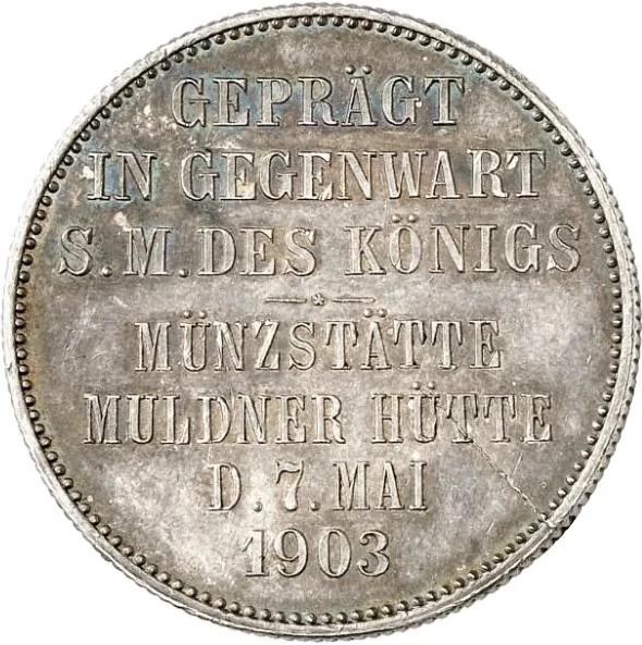 Inscription: GEPRÄGT // IN GEGENWART // S. M. DES KÖNIGS // -*- // MÜNZSTÄTTE // MULDNER HÜTTE // D. 7. MAI // 1903