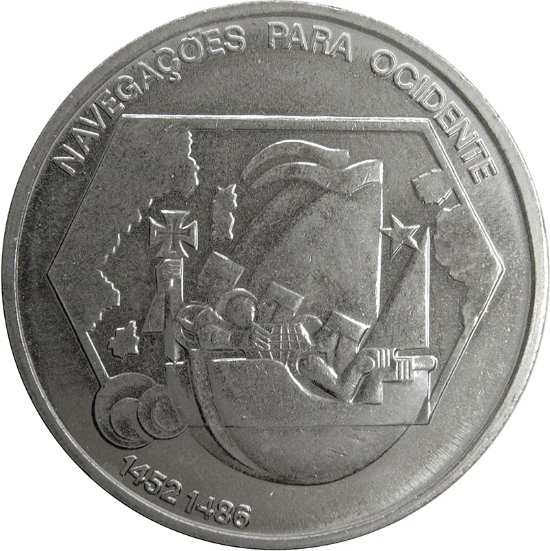 Portugal's coat of arms over Toscanelli's 1474 map within a hexagon, showing Europe, Africa, Asia, and Cipangu. Below are the coin's value and date.
