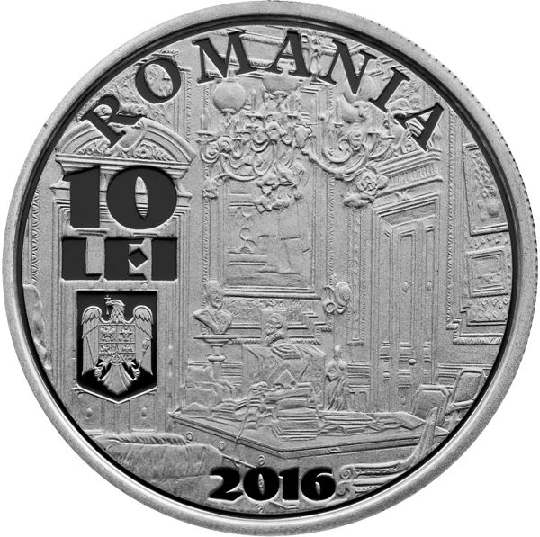 Vintage image of Romania’s Governor’s Office, with "ROMANIA," 10 LEI, the coat of arms, and 2016.