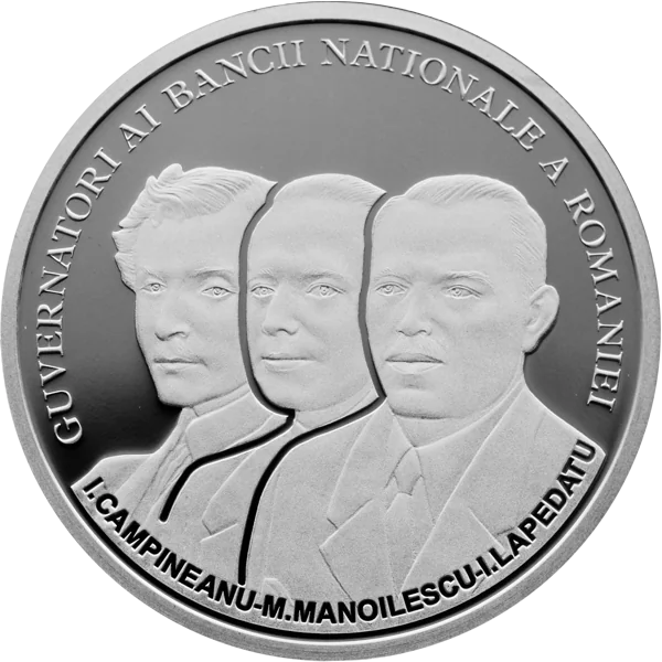 Portraits of governors I.Campineanu, M.Manoilescu, and I.Lapedatu, with the inscription "GUVERNATORI AI BANCII NATIONALE A ROMANIEI".