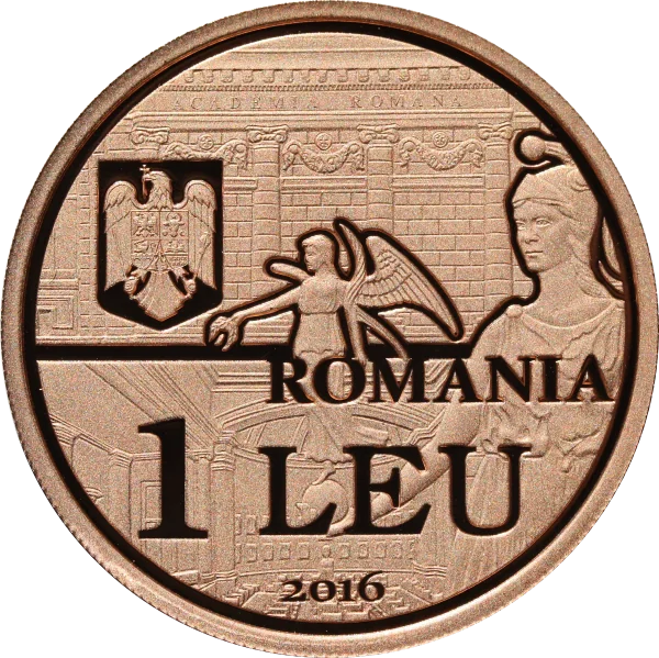 Goddess Minerva from the Romanian Academy's coat of arms, superimposed over its headquarters pediment and assembly hall. Includes Romania's coat of arms, "ROMANIA", "1 LEU", and "2016".