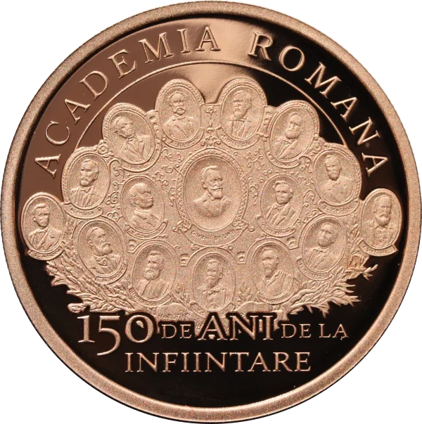 Portraits of the Romanian Academy's founders with the inscriptions "ACADEMIA ROMÂNĂ" and "150 DE ANI DE LA ÎNFIINTARE."