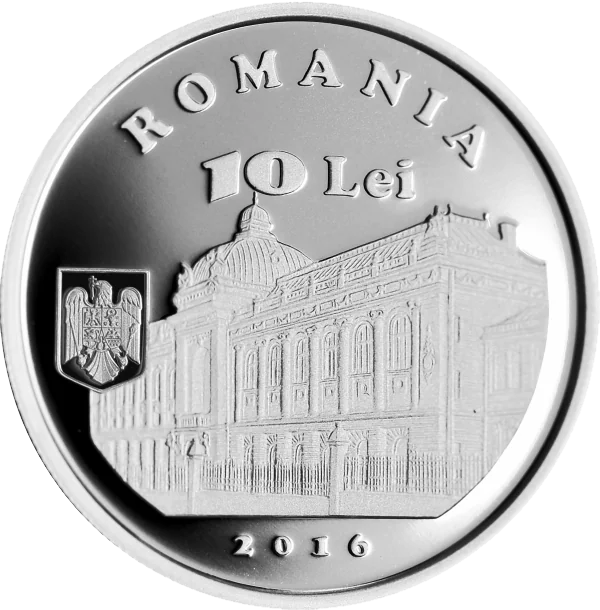 A 2016 ten-leu coin featuring the University of Iași, where Petru Poni taught, with an arched "ROMANIA" inscription, Romania's coat of arms, and the year.
