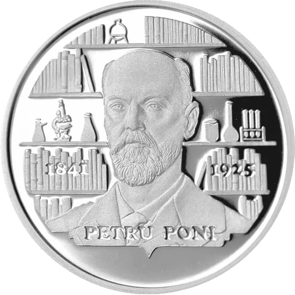 A portrait of Petru Poni depicting his teaching and scientific work, with the inscription "PETRU PONI" and his lifespan, 1841–1925.