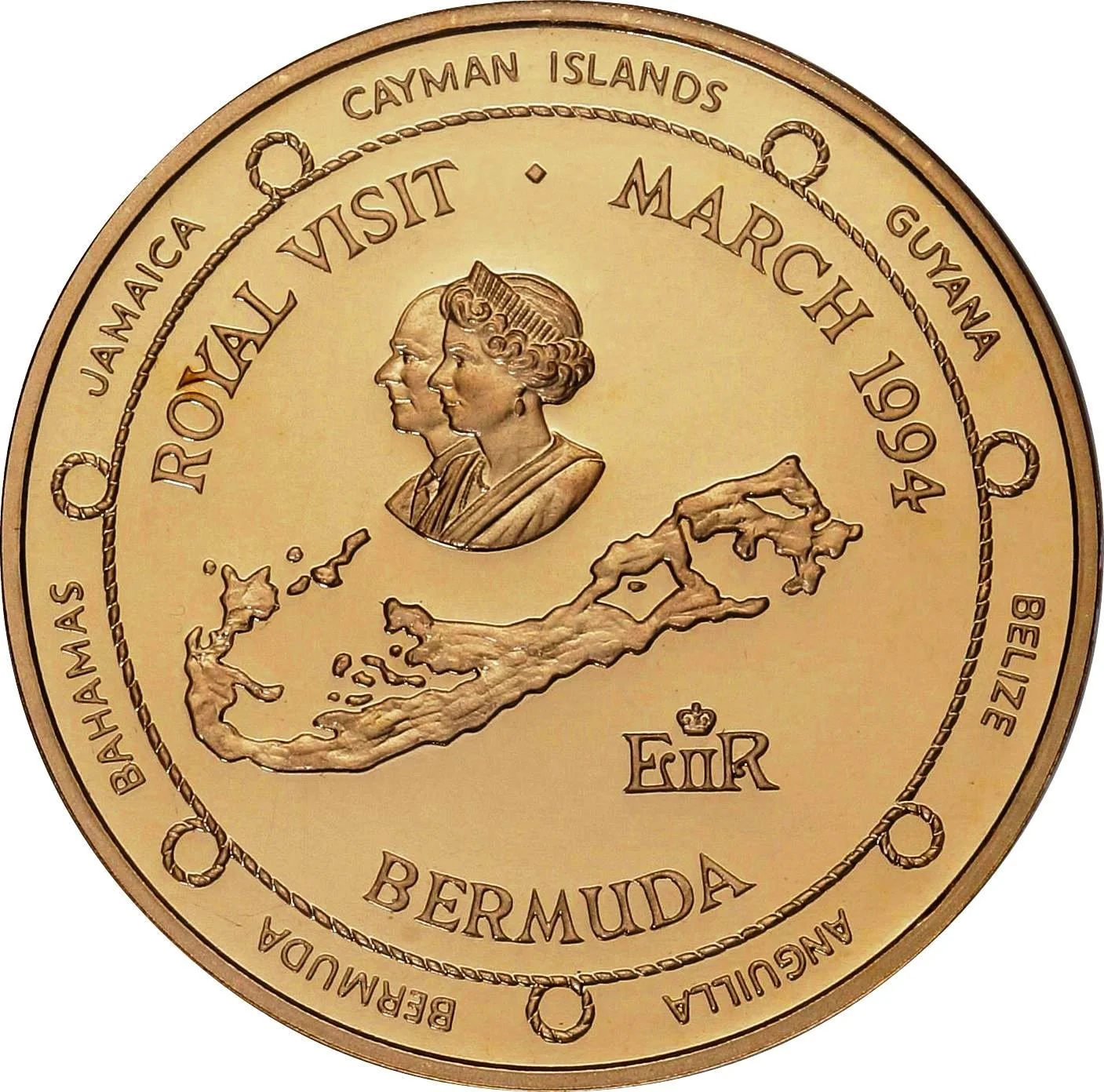 Conjoined busts of Elizabeth II and Philip left of Bermuda's map, encircled by rope.
