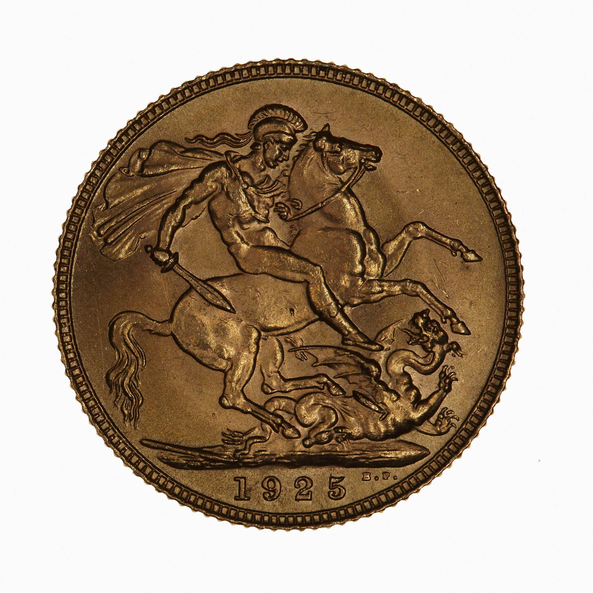 St. George on horseback, right, in helmet and cape, slaying a dragon with his sword. Date and initials in exergue. Mintmark varieties exist.