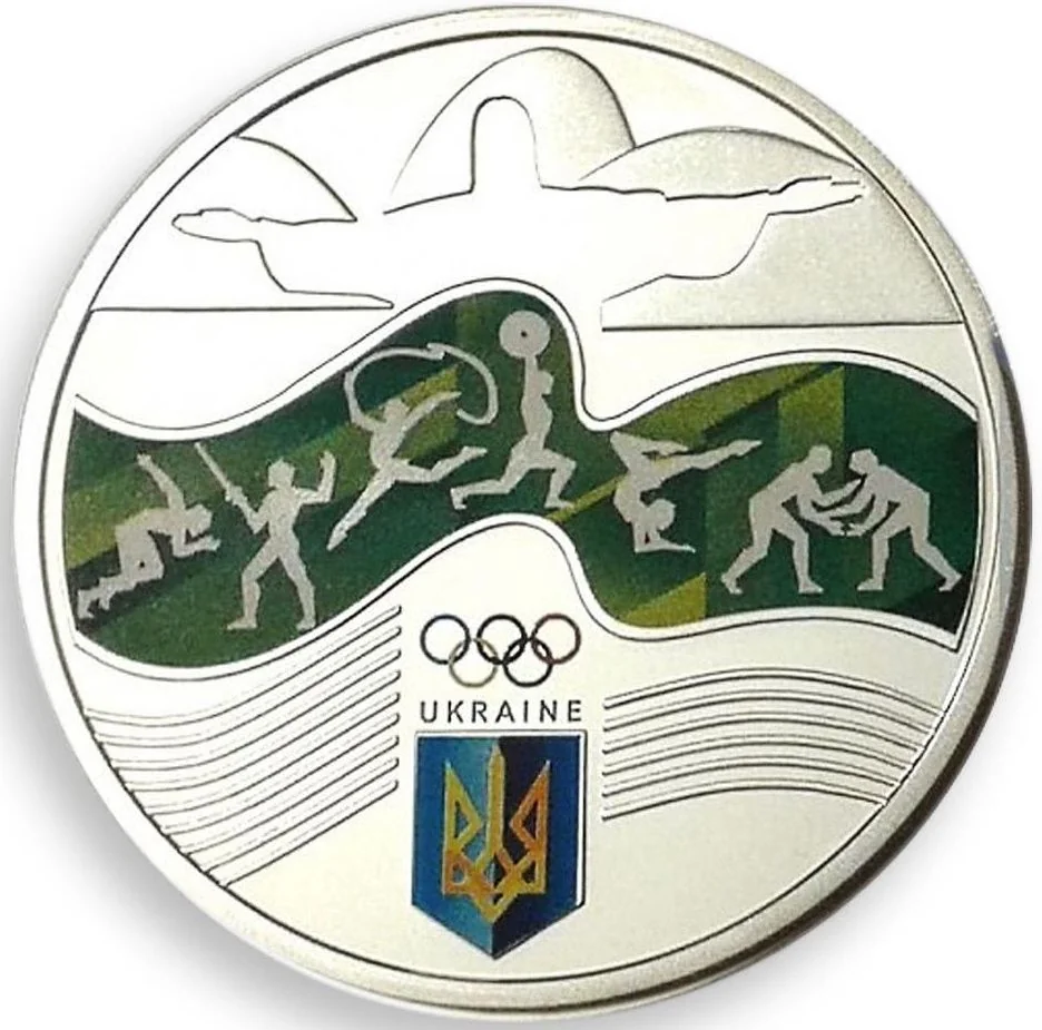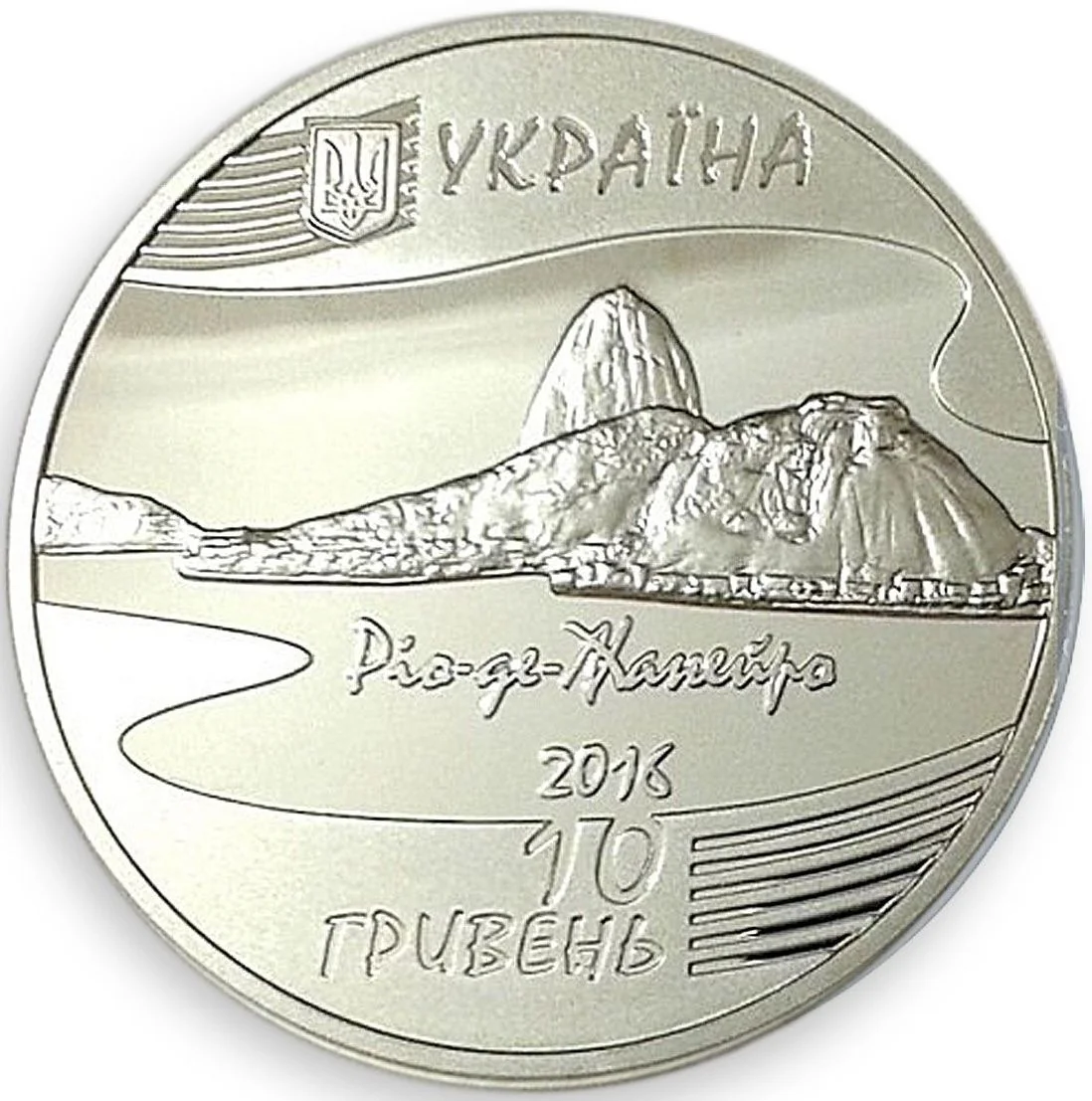 The coin features the Small Coat of Arms of Ukraine and the inscription УКРАЇНА. It depicts Rio de Janeiro's Guanabara Bay with Sugarloaf Mountain, along with the inscriptions РІО-ДЕ-ЖАНЕЙРО, 2016, and the face value 10 ГРИВЕНЬ.