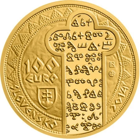 The obverse shows a Great Moravian church plan in Devín, containing Glagolitic letters. Decorative beads line the edge, with the Slovak coat of arms lower left. To the right are the designer's initials "RL" (Roman Lugár) and the Kremnica Mint mark.