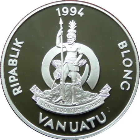 Vanuatu's arms depict a Melanesian warrior before a curved boar's tooth, a scroll reading "LONG GOD YUMI STANAP," and the date.
