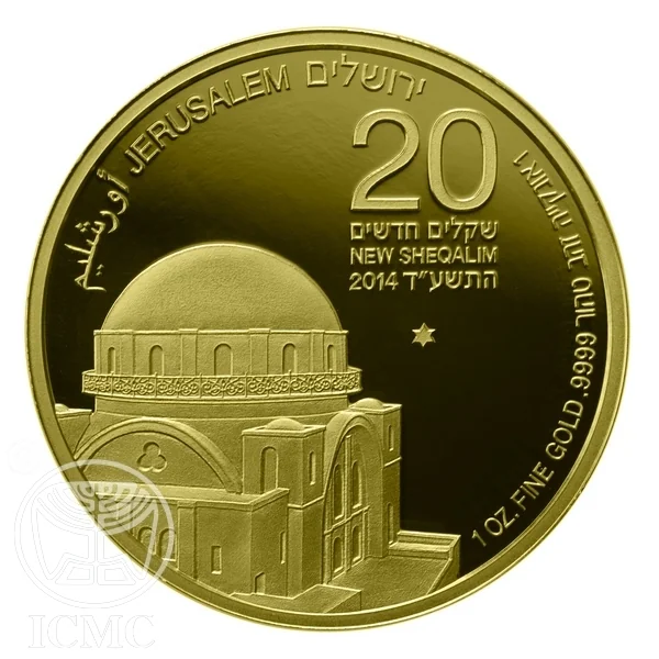The Hurva Synagogue. The top border reads "Jerusalem" in English, Hebrew, and Arabic, with the face value, mint year, and Star of David mint mark to the right.