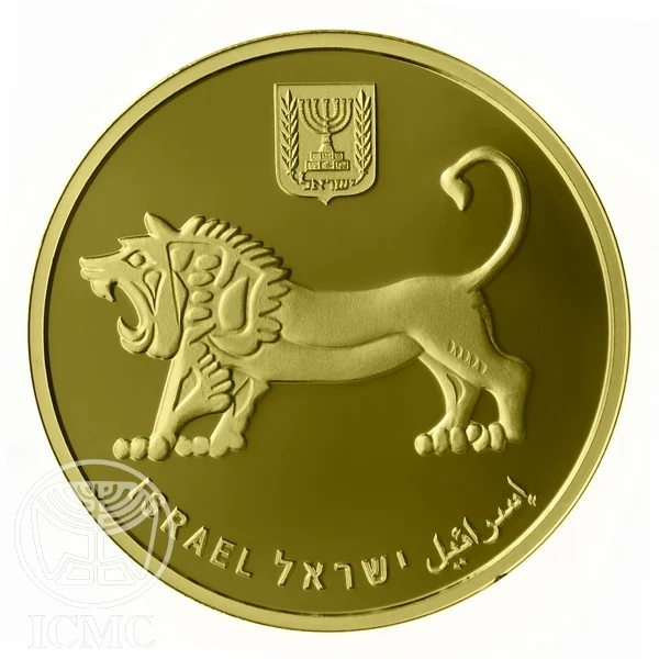 Israel's emblem features a roaring lion from an 8th-century BCE seal of Shema, servant of King Jeroboam II, with "Israel" in English, Hebrew, and Arabic.