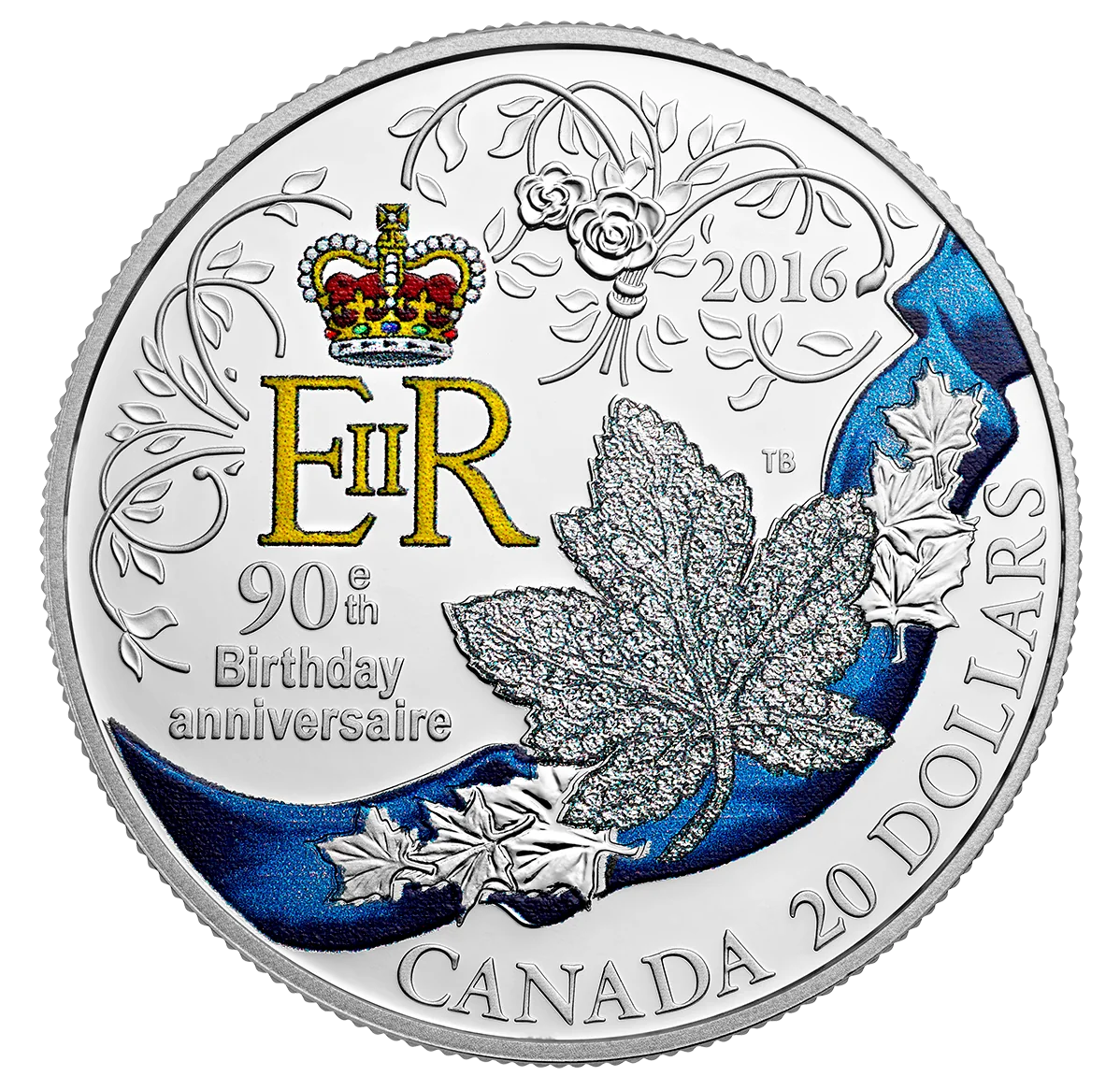 The Royal Cypher (EIIR) and St. Edward's Crown above a maple leaf on a blue sash, with a glittering, diamond-like effect.