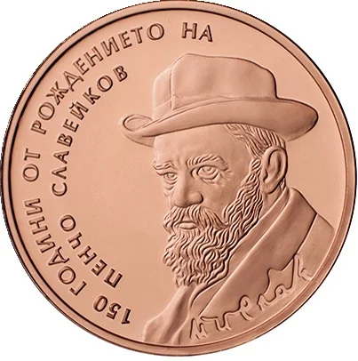 The reverse features Pencho Slaveikov's portrait and signature, with the circumferential inscription: "150 ГОДИНИ ОТ РОЖДЕНИЕТО НА ПЕНЧО СЛАВЕЙКОВ".