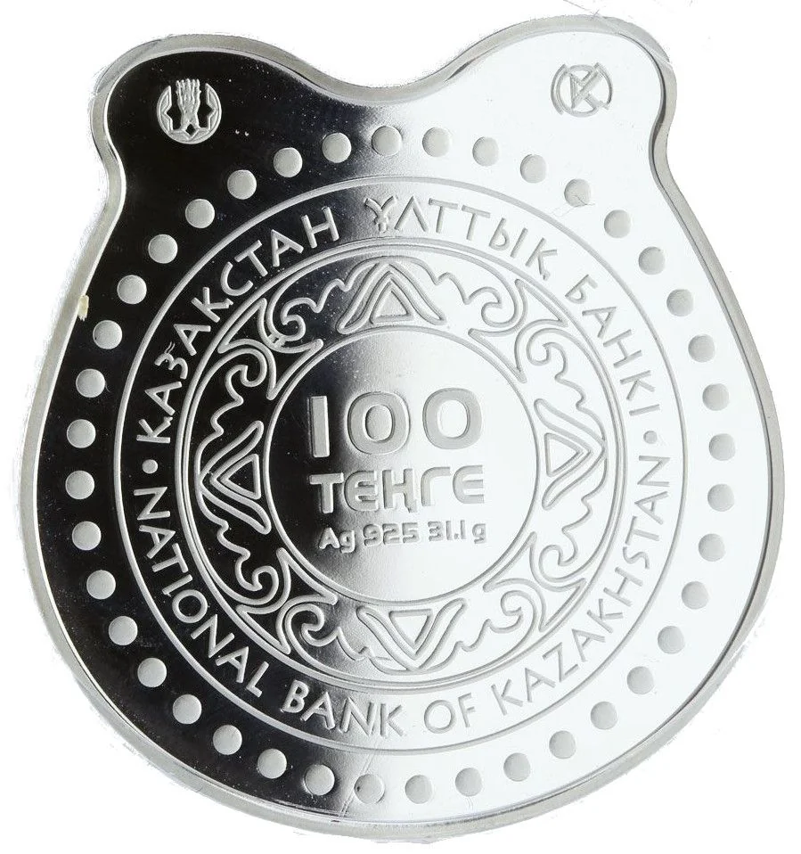 Description: The inscriptions "100 ТЕНГЕ" and "Ag 925 31.1 g" are framed by national ornament, the text "ҚАЗАҚСТАН ҰЛТТЫҚ БАНКІ" and "NATIONAL BANK OF KAZAKHSTAN", dots, and rim inscriptions. The stylized horseshoe's ends feature the National Bank logo and the Kazakhstan Mint trademark.