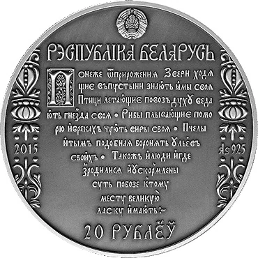 Description: Featuring the State Coat of Arms of Belarus and the circumferential inscription "РЭСПУБЛІКА БЕЛАРУСЬ." The center displays a quote about love of country from Skaryna's "Juduth." Flanking ornamental patterns contain the year of issue and the silver alloy standard. The denomination "20 РУБЛЁЎ" is at the bottom.