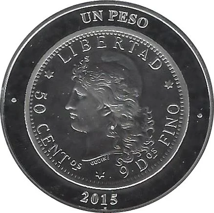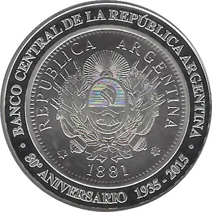 Description: The obverse of the 50 centavos 1881 features the Argentine national shield flanked by 14 provincial flags and two cannons. Above is "BANCO CENTRAL DE LA REPUBLICA ARGENTINA" and below "80° ANIVERSARIO 1935 - 2015".