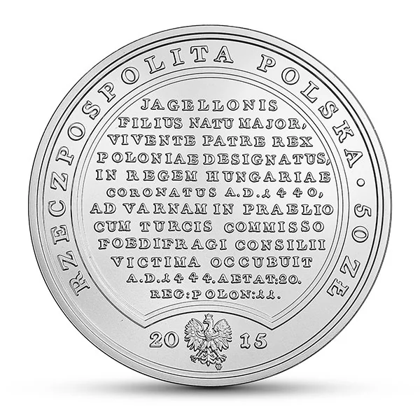 JAGELLONIS FILIUS NATU MAJOR, VIVENTE PATRE REX POLONIAE DESIGNATUS, IN REGEM HUNGARIAE CORONATUS A.D.I 440, AD VARNAM IN PRAELIO CUM TURCIS COMMISSO FOEDIFR AGI CONSILII VICTIMA OCCUBUIT A.D.I 444. AETAT:20. REG:POLON:II.