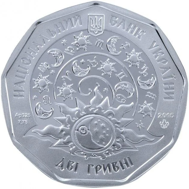 The obverse features Ukraine's Small Coat of Arms with the inscription "НАЦІОНАЛЬНИЙ БАНК УКРАЇНИ." Below is the face value "ДВІ ГРИВНІ" and a stylized composition of zodiac signs, the moon, and sun against a starry sky. To the left are the metal specifications (Ag 925, 7.78), and to the right are the issue year (2015) and the Mint mark.