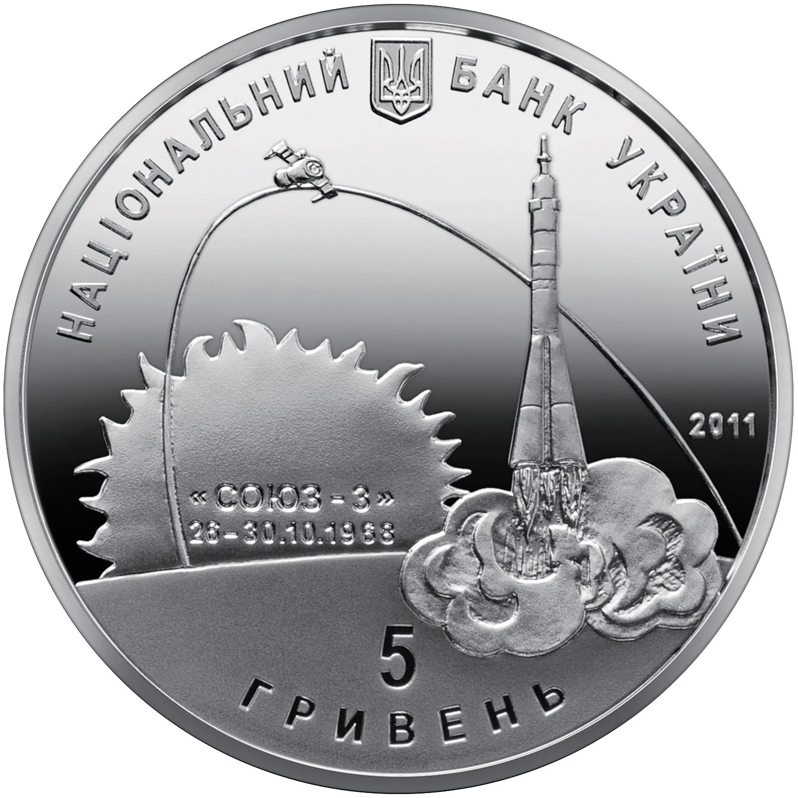 Description: The obverse features Ukraine's Small Coat of Arms with the inscription "НАЦІОНАЛЬНИЙ БАНК УКРАЇНИ." The reverse depicts the Soyuz 3 mission docking with Soyuz 2 in Earth's shadow, with the legends "Союз 3"/"26-30.10.1968," the issue year "2011," and the face value "5 ГРИВЕНЬ."