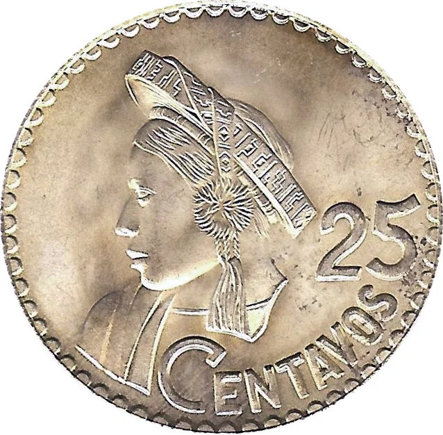 Concepción Ramírez (born 1942) is a Guatemalan peace activist depicted on the coin wearing her traditional tocoyal head-dress.