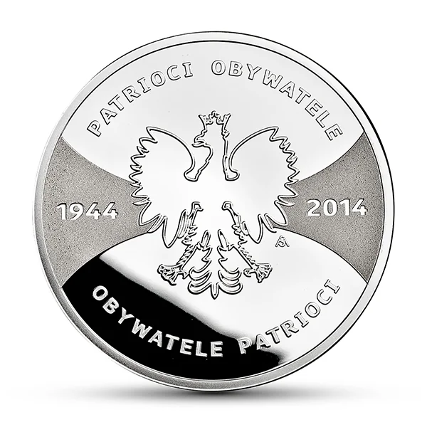 Poland's crowned eagle with the dates 1944 (Warsaw Uprising) and 2014 (its 70th anniversary). The text "PATRIOCI OBYWATELE - OBYWATELE PATRIOCI" links the concepts of "Citizen" and "Patriot" across time.