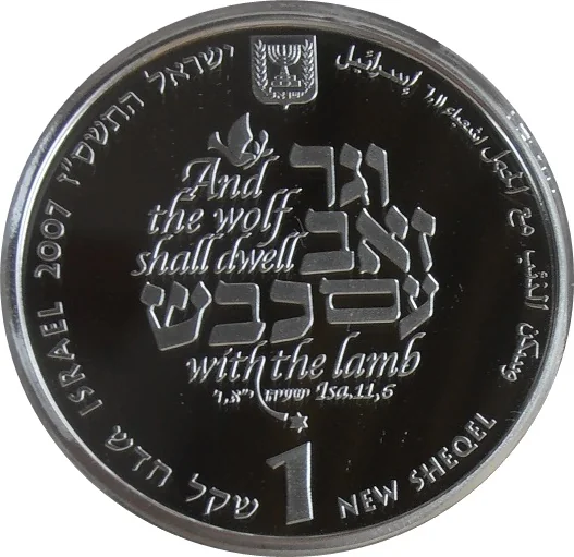 Face value in Hebrew and English, State emblem, "Israel" in three languages, and mint year. A dove with an olive branch appears above the verse "And the wolf shall dwell with the lamb Isaiah 11:6" in Hebrew and English.