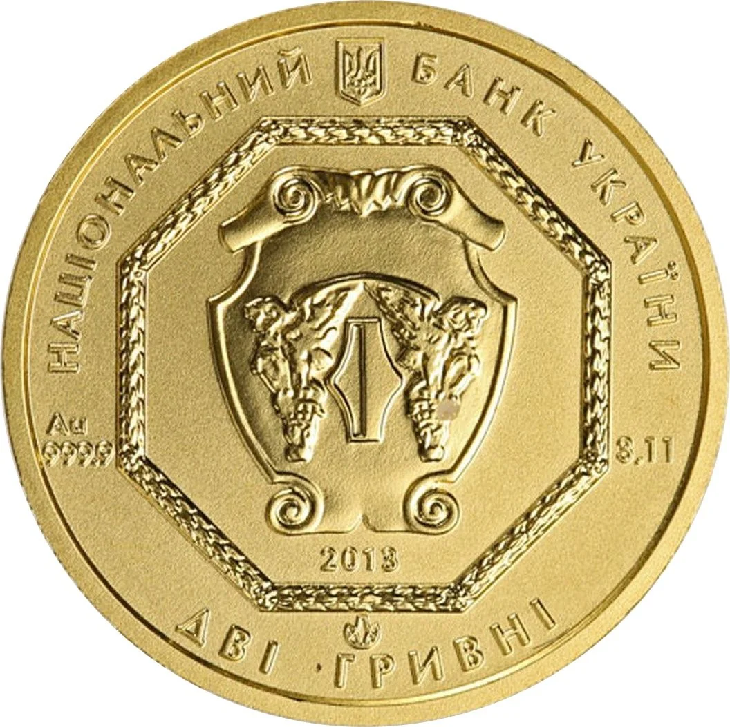 The obverse features Ukraine's Small Coat of Arms and the inscription "National Bank of Ukraine." The central octagonal cartouche depicts the Bank's emblem: two griffins guarding a hryvnia, symbolizing the protection and growth of the nation's gold reserves. Also shown are the coin's face value, issue year, metal, fineness, and weight.