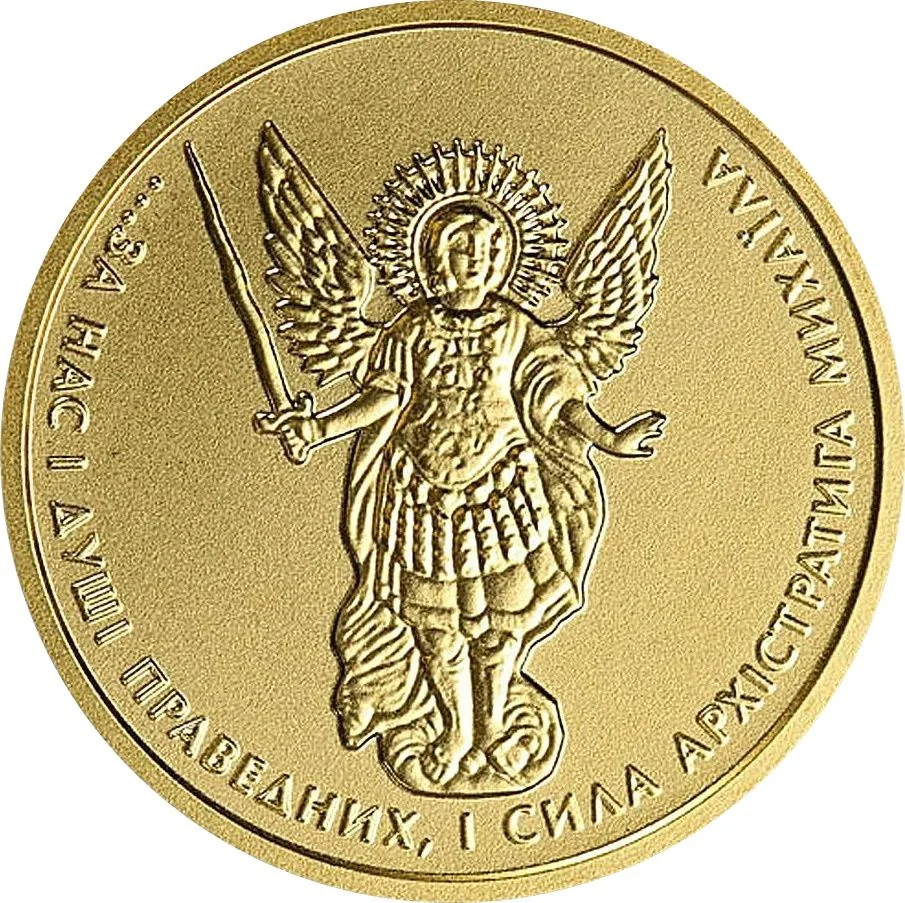 The Taxiarch Archangel Michael (Archistrategos), a patron of warriors and the suffering. The circular inscription, from Shevchenko's 'Haydamaks,' reads: "FOR US AND SOULS OF RIGHTEOUS MEN, AND ARCHISTRATEGOS MICHAEL'S STRENGTH."