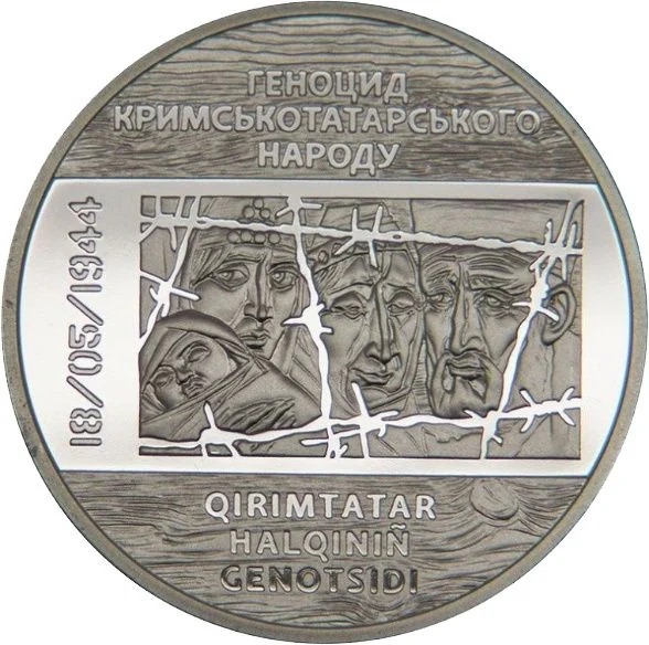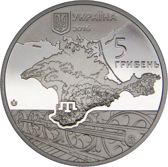 Ukraine's 5-hryvnia coin (2016) features the Small Coat of Arms. The reverse shows a map of Crimea with the Tatar tamga emblem and train wheels symbolizing the deportation. The Mint mark is to the left.