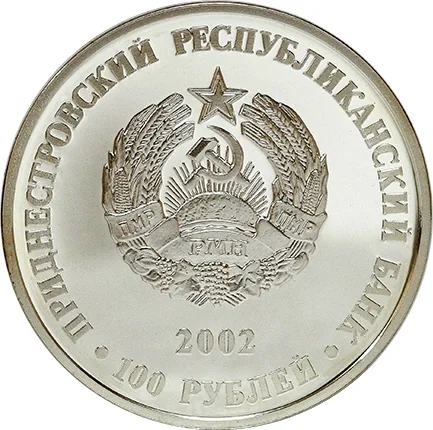 Centered State Emblem of PMR, circled above by "ПРИДНЕСТРОВСКИЙ РЕСПУБЛИКАНСКИЙ БАНК" and below by "100 РУБЛЕЙ". The year "2002" is under the emblem.