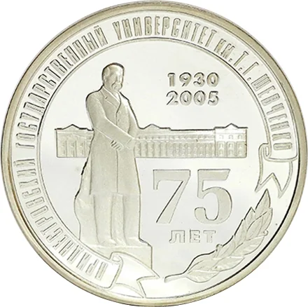 Shevchenko Monument, with "75 Years" on the right. The University's main building is in the background, with the dates 1930-2005 above. The circular inscription reads: "Transdniestrian State University named after T.G. Shevchenko."