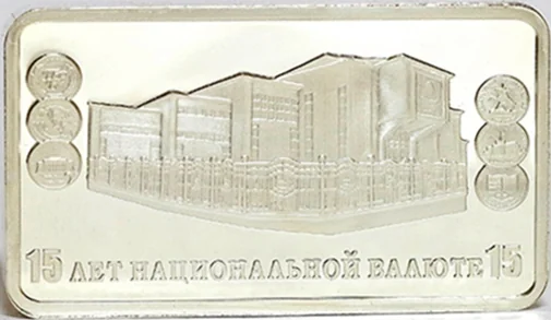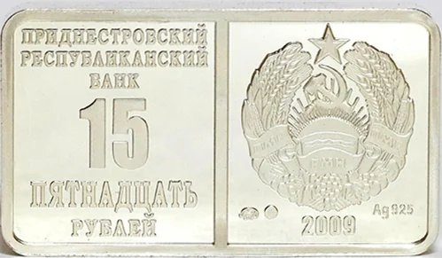 Description: Rectangular coin divided by a central band. Right side: State Emblem of the Transdniester Moldavian Republic, with "2009" below, flanked by the mintmark and metal purity. Left side: Inscriptions "ПРИДНЕСТРОВСКИЙ РЕСПУБЛИКАНСКИЙ БАНК" (Transdniestrian Republican Bank), the numeral "15", and "ПЯТНАДЦАТЬ РУБЛЕЙ" (Fifteen Roubles).