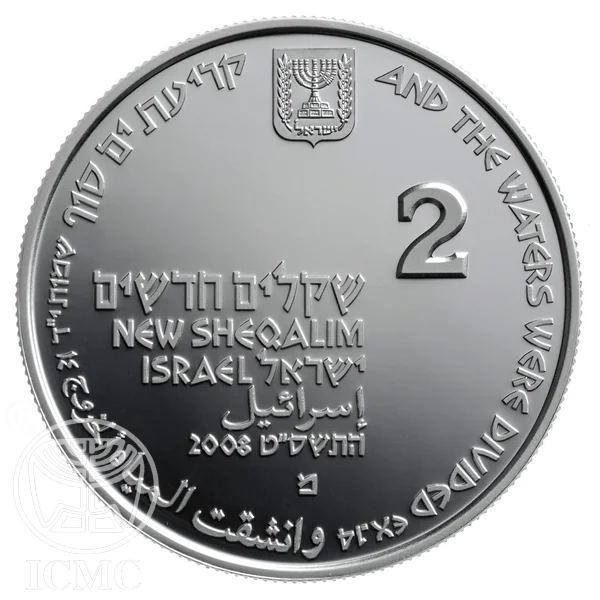 Face value, state emblem, "Israel" in three languages, and mint year; "AND THE WATERS WERE DIVIDED EX.14" along the border in Hebrew, English, and Arabic.