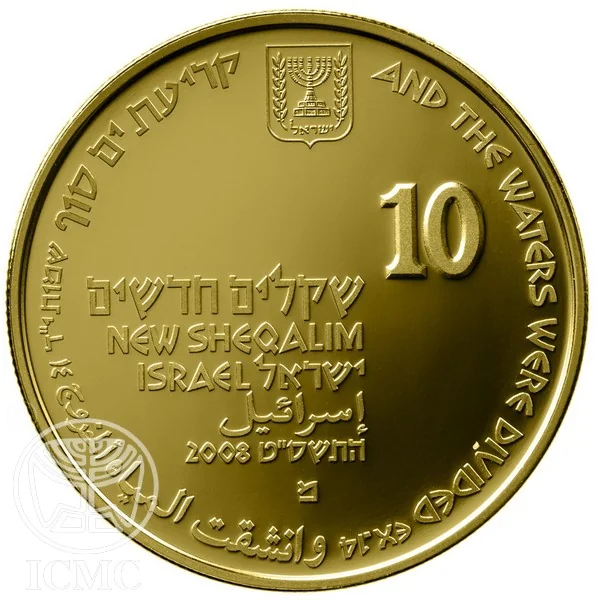 Face value, state emblem, "Israel" in three languages, and mint year; "AND THE WATERS WERE DIVIDED EX.14" along the border in Hebrew, English, and Arabic.