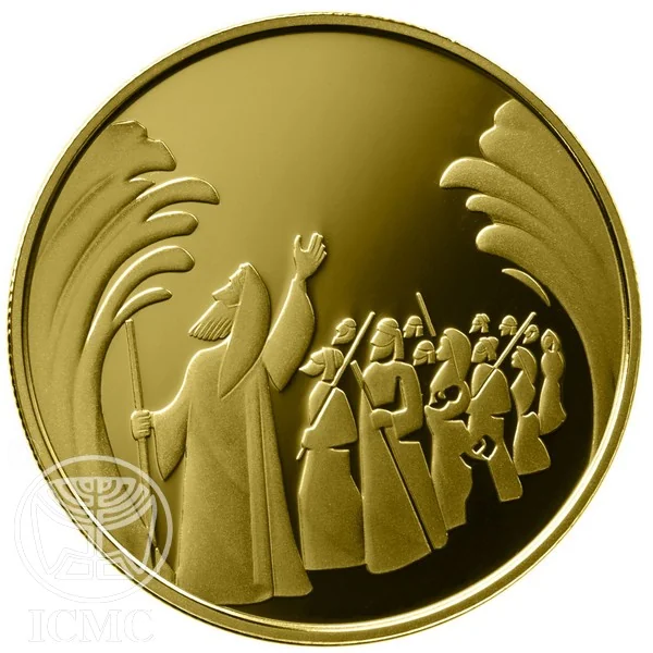 Moses leading the Israelites through the parted sea, with walls of water on either side.