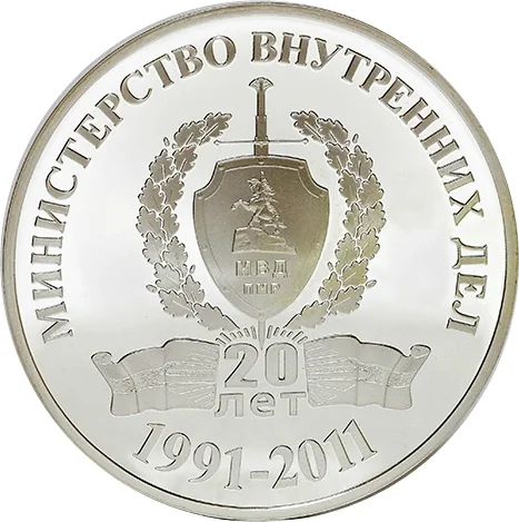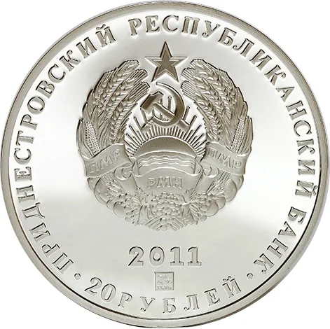 Description: State Emblem of the Transnistrian Moldavian Republic. Below, the year "2011", mint mark, metal specification, alloy fineness, and weight. Circular inscription: above, «ПРИДНЕСТРОВСКИЙ РЕСПУБЛИКАНСКИЙ БАНК» (TRANSDNIESTER REPUBLICAN BANK); below, «20 РУБЛЕЙ» (20 ROUBLES).