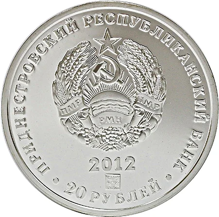 Description: State Emblem of the Transnistrian Moldavian Republic. Circular inscription: top - "ПРИДНЕСТРОВСКИЙ РЕСПУБЛИКАНСКИЙ БАНК" (TRANSDNIESTER REPUBLICAN BANK), bottom - "20 РУБЛЕЙ" (20 ROUBLES). Below the emblem: the year "2012", mint mark, metal, alloy fineness, and weight.