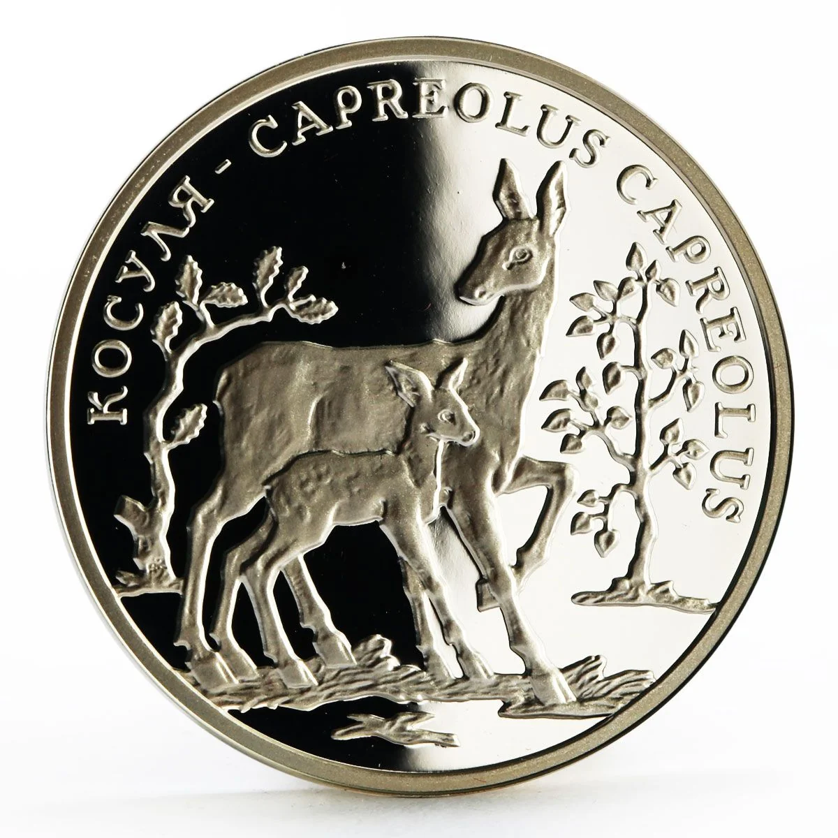 A roe deer and fawn in a forest, encircled by the Cyrillic inscription "КОСУЛЯ - CAPREOLUS CAPREOLUS".