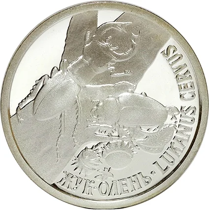 The coin's center features two stag-beetles on an oak trunk, encircled by the inscription "ЖУК-ОЛЕНЬ" and "LUCANUS CERVUS".