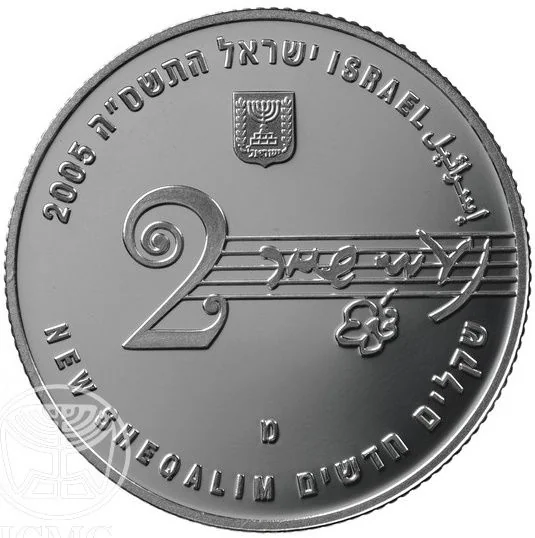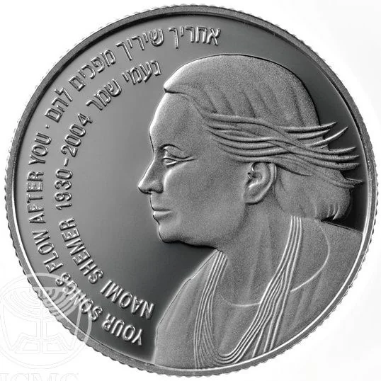 Israel State Emblem, face value in Hebrew/English, "Israel" in three languages, mint year, musical staff with "Naomi Shemer" and a flower.