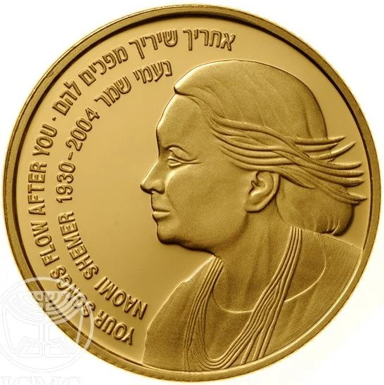 Naomi Shemer portrait with border inscriptions: "Your songs flow after you" and "Naomi Shemer 1930-2004" in Hebrew and English.