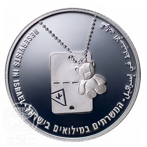 A soldier's ID tag bearing the Hebrew "tzadi" (צ); a small teddy bear symbolizing home and family; encircled by the inscription "Reservists in Israel" in Hebrew, English, and Arabic.