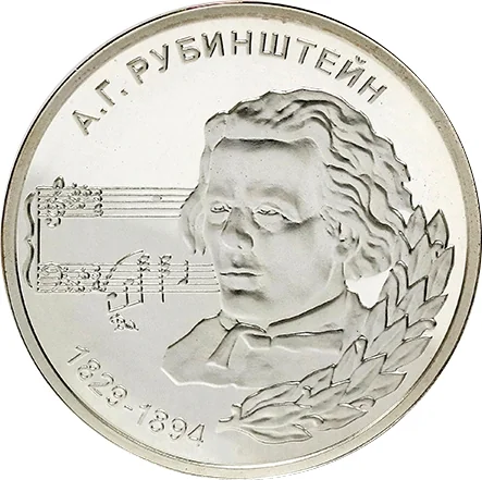 Description: The center features a portrait of Anton Rubinstein, framed by a laurel wreath on the right and the Cyrillic inscription "А.Г. РУБИНШТЕЙН" above. To the left are the opening notes of his "Barcarole." The dates “1829 – 1894” appear at the bottom.