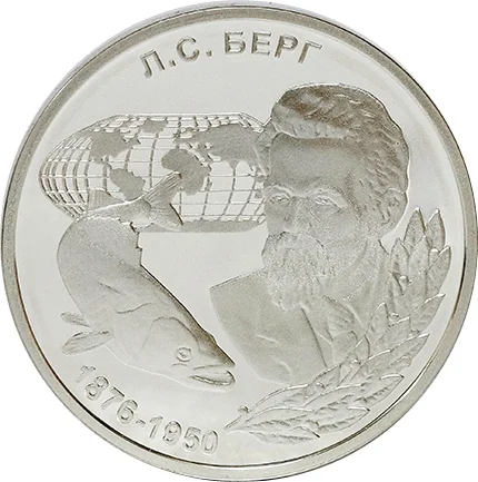 On the right is a portrait of L.S. Berg framed by a laurel wreath. To the left are a stylized map and a pike-perch. Above is the semicircular Cyrillic inscription "Л.С. БЕРГ"; below the fish is his lifespan "1876-1950," also in a semicircle.