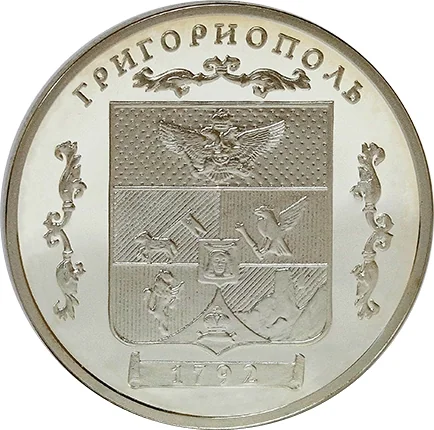 The town's 1794 Russian Empire emblem is centered, framed by ornamental leaves on the sides and top. "ГРИГОРИОПОЛЬ" arches above, and a ribbon below bears the city's founding year, "1792".