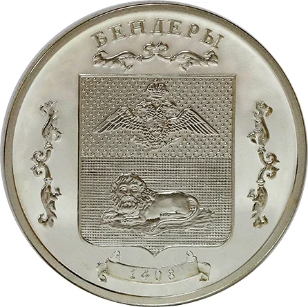 The emblem is framed ornamentally, topped with the Cyrillic inscription "БЕНДЕРЫ" and a ribbon below reading "1408," the city's founding year.